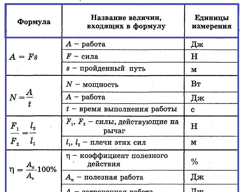 КПД | 𝛈 – кпд – полезная работа (Дж) – затраченная работа (Дж) | |